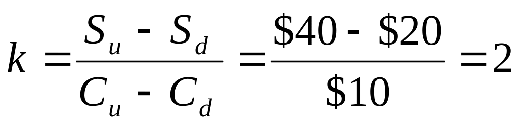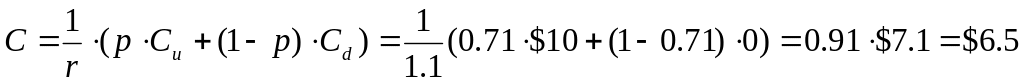Задача 6.3 В рамках однопериодной модели вычислить цену опциона CALL на акцию при ее первоначальной стоимости $30, цене исполнения $30, вероятном увеличении цены акции до $40 и уменьшении до $20, безрисковая процентная ставка на период до исполнения опциона 10%. Найти коэффициент полного хеджирования.