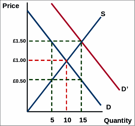 Q56 In the diagram below, the demand for a given good has shifted left (from D’ to D), the original market price was £1.50 for this product. Given this change in demand which of the following is likely to occur?