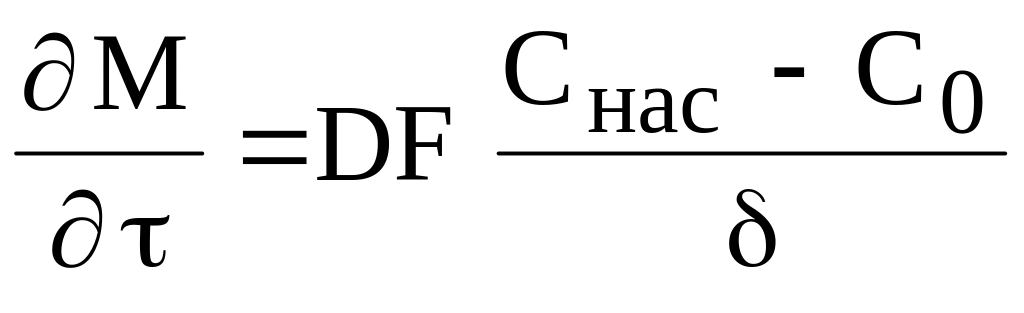 Наиболее резкое падение концентрации от Снас до С происходит в диффузионном слое жидкой фазы (пограничном), где лимитирующим является перенос растворяемого вещества путем молекулярной диффузии.