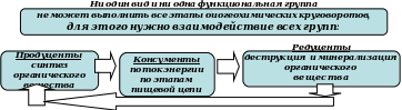 Группировки организмов: продуценты, консументы и редуценты, образуют цепочки, в которых каждый вид и каждая группа выполняет определенные функции. Ни один вид и ни одна функциональная группа не может выполнить все этапы биогеохимических круговоротов, для этого нужно взаимодействие всех групп: