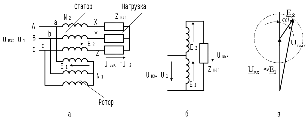 В качестве первичной обмотки обычно используется обмотка ротора (рис.2.7а), вторичной служит обмотка статора. Входное напряжение подводится к началам abc обмотки ротора и к началам ABC обмотки статора, выходное напряжение снимается с концов XYZ обмотки статора.