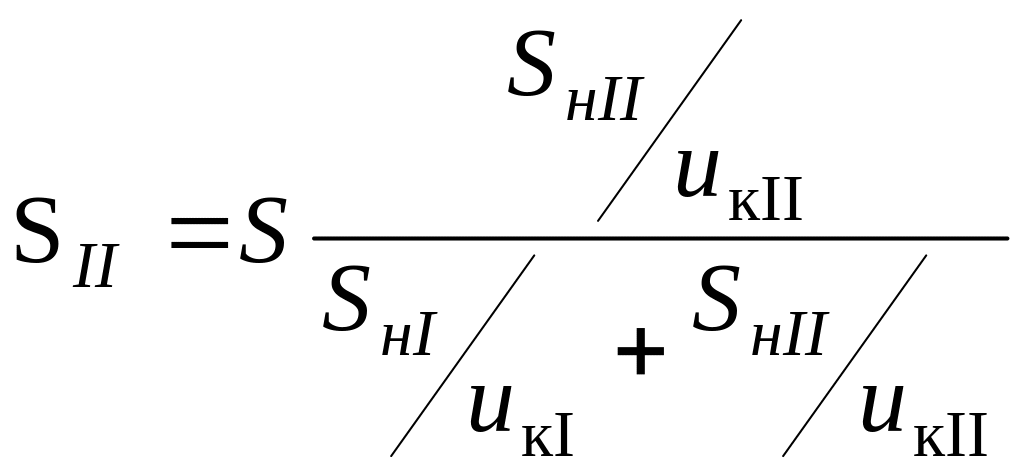 Мощность, которой будет загружен каждый из трансформаторов можно выразить через общую мощность нагрузки S=SI+SII. Заменяя в (1.76) SII на S-SI и решая уравнение относительно SI, получаем
