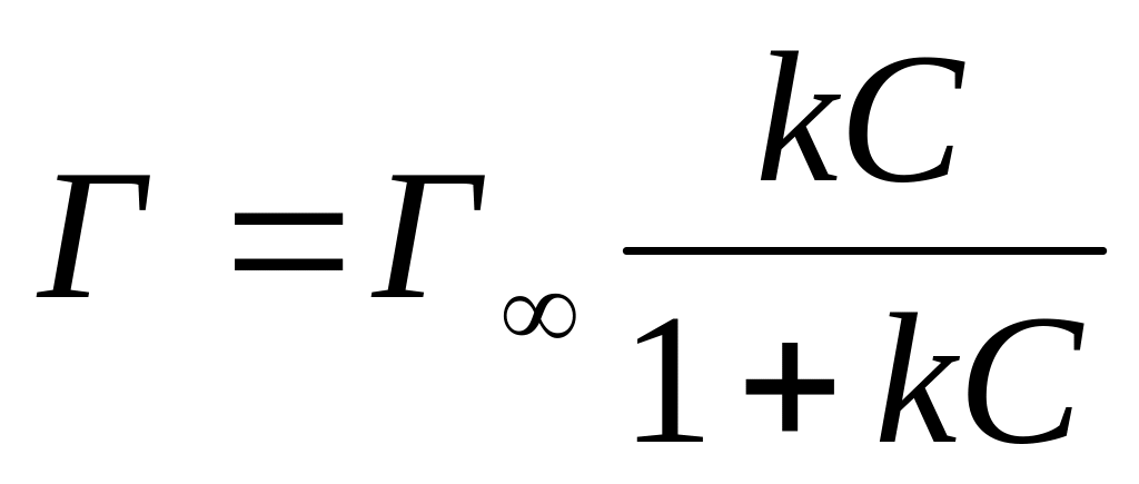 Уравнение Лэнгмюра хорошо согласуется с данными опыта и правильно отражает ход кривой Г=f(с), а именно: при малых концентрациях (kC<<1) уравнение дает прямую пропорциональность между адсорбцией Г и концентрацией C; при больших концентрациях (kC>>1) уравнение приводит к предельному значению адсорбции Г = Г. Уравнение (3.3) позволяет вычислить константы, в частности величину Г являющуюся важнейшей характеристикой, позволяющей вычислить размеры адсорбируемых молекул.