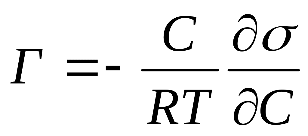 Зависимость между изменением свободной поверхностной энергии на поверхности раствора и концентрацией вещества в поверхностном слое, т. е адсорбцией на границе раздела фаз, выражена уравнением Гиббса: