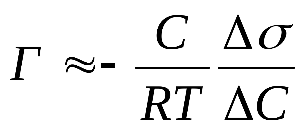 Другой путь, более распространенный, хотя и менее точный, состоит в вычислении конечных разностей величин поверхностного натяжения 1 и 2, измеренных при двух различных концентрациях С1 и С2. Эти разности 2 - 1=∆ и С2 – Сl = ∆С подставляют в уравнение Гиббса: