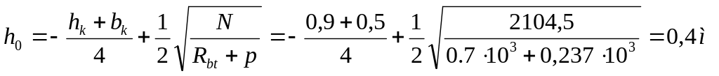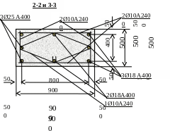 Исходные данные. Бетон В15, Rb= 8,5 МПа, (8,5·103кН/м2), Rbt= 0,7МПа, (0,7·103кН/м2).Арматура фундамента А300, Rs= R's= 270MПа, (270·103кН/м2), Условное расчетное сопротивление грунта R0=0,25МПа. Колонна сплошная hк×bк =0,9×0,5м. Арматура колонны Ø25А400. Расчетный момент М = 277,2кНм, расчетная нормальная сила N=2104,5кН, вес фундамента и грунта на его обрезах γm= 20кН/м3, глубина заложения фундамента Н1=1,4м (из условия промерзания).