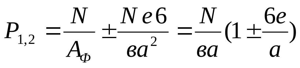 Краевые давления Р1 и Р2 под подошвой фундамента определяют при линейном распределении реакции грунта по формулам.