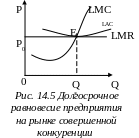 Равновесие в отрасли будет наблюдаться тогда, когда предприятия, составляющие эту отрасль не будут расширять или сокращать объемы производства и не попытаются ее покинуть, а новые предприятия не будут делать попыток войти в нее. Это достигается тогда, когда цена будет равна минимальным долгосрочным средним издержкам (LACmin) для объема производства, при котором цена (Р0) равна долгосрочным предельным издержкам (LMC) (рис. 14.5). Таким образом, равновесие в отрасли предполагает, что предприятия, функционирующие в ней получают только нормальную прибыль, другими словами, их экономическая прибыль равна нулю. Точка Е на рис. 14.5 – точка равновесия предприятия в долгосрочном периоде.