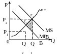 На рис. 23.1 видно, что при наличии негативного внешнего эффекта экономическое благо продается и покупается в большем объеме (Q1) по сравнению с его эффективным размером (Q2). MSB на рис. 23.1 отображает величину предельных общественных выгод (предельной общественной полезности) – дополнительной полезности, получаемой при выпуске еще одной единицы товара.