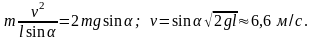 Задача 2.Груз массой т = 100 кг, подвешенный на невесомом тросе длиной l = 3 м, в результате толчка стал двигаться, как конический маятник, причем трос отклонен от вертикали на угол α = 60° (рис. 50). Определить скорость груза v и силу натяжения троса R.
