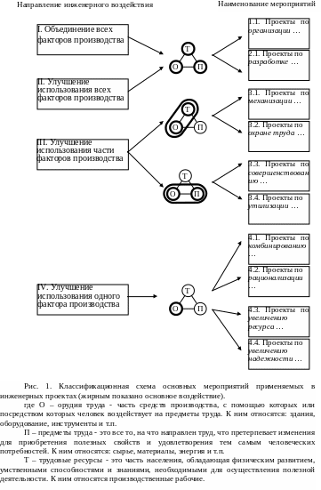 На рисунке 1 представлена классификация области инженерного влияния на производственную систему. Отличительная особенность инженерных мероприятий заключается в основном либо косвенном воздействии на орудия труда. Иными словами инженер через улучшение использования орудий труда, повышает эффективность производства. Результатом инженерного воздействия являться: