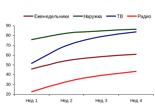 Рис. 2.3. Накопление охвата с использованием различных медиа
