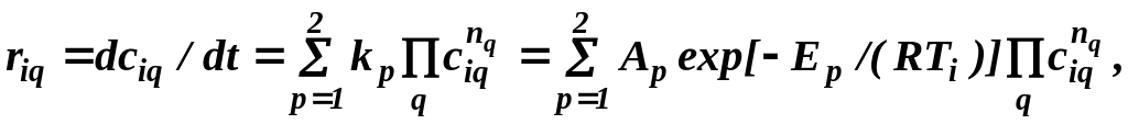 Такая последовательность при составлении уравнений и проведении их дифференцирования ведет к блочно-тридиагональной структуре матрицы Якоби с минимальной длиной блоков. Для достижения гибкости в выборе закрепленных при расчете переменных уравнения, определяющие их значение или соотношение между ними, включают в качестве дополнительных строк в нижней части стандартной системы, а дополнительные переменные - в качестве столбцов в правой части матрицы Якоби. Скорости химических превращений rin в жидкой фазе могут быть представлены уравнениями, в которых они выражены как функции от состава жидкой фазы и температуры. Задержкой паровой фазы и протеканием в ней химической реакции, как правило, пренебрегают. Напомним, что vj - стехиометрический коэффициент компонента j в -ой химической реакции является положительной величиной, если j-ый компонент образуется за счет -ой реакции. Одна из возможных форм записи уравнения для расчета скоростей химической реакции, соответствующая закону действующих масс, имеет следующий вид: