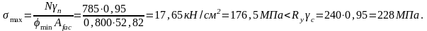Уточнюємо значення коефіцієнта поздовжнього згину при λmax.= λх=105,7, Ry =240МПа: за табл. 72 Норм [1], інтерполюючи, знаходимо коефіцієнт поздовжнього згину φmin =0,800.
