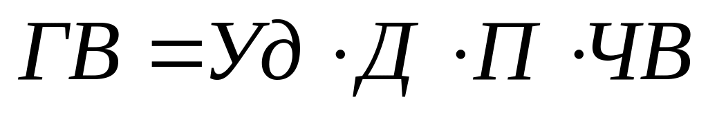 Наиболее обобщающий показатель производительности труда − выполненный объем строительно-монтажных работ на одного среднегодового работника, т.е. годовая его выработка (ГВ). Величина ее зависит не только от среднедневной (ДВ) и среднечасовой выработки (ЧВ), но и от удельного веса рабочих в общей численности работников предприятия (Уд), количества отработанных дней одним рабочим за год (Д) и продолжительности рабочего дня (П). Чем выше среднечасовая выработка и чем меньше целодневные и внутрисменные потери рабочего времени, тем больше выход продукции на одного работника в год.