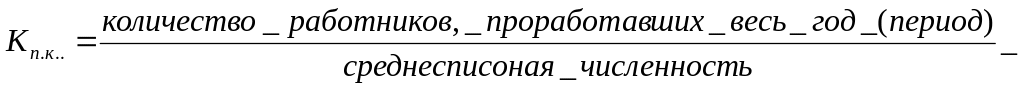 Относительные показатели – коэффициенты интенсивности оборота по приему (Кпр), увольнению (Кув), общего оборота (Коб), где в числителе формулы абсолютные величины оборота, а в знаменателе среднесписочная численность. Также анализируют коэффициент постоянства кадров (Кп.к.) по формуле: