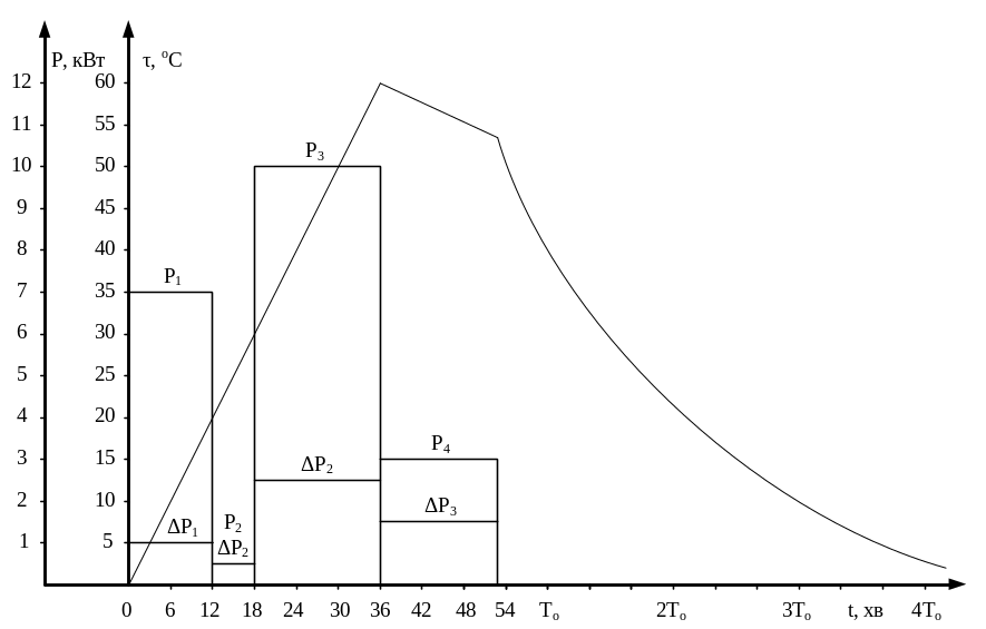 Рис. 3 – Навантажувальна діаграма, та крива нагрівання і охолодження електродвигуна