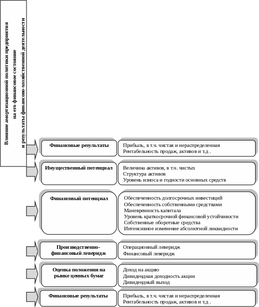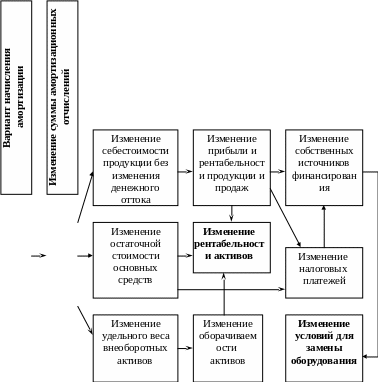 Рис. 3.16. Схема влияния варианта начисления амортизации на результаты деятельности предприятия