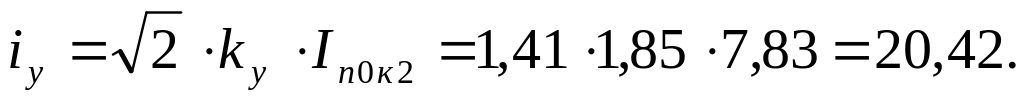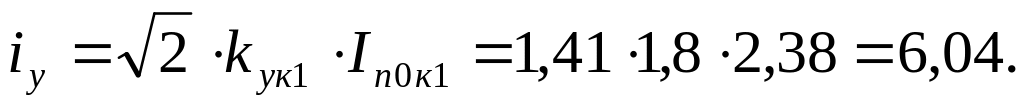 Ударний струм при к. з. в точці К2. Ударний коефіцієнт визначається з табл. 4.1 [5] для системи, що пов’язана зі збірними шинами 6-10 кВ, через трансформатор потужністю Sнтр = 40 МВА: