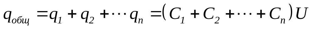 В случае параллельного соединения все конденсаторы заряжаются до одной и той же разности потенциалов U, но заряды на них могут быть различными. Если их электроемкости равны С1, С2 …, Сп, то соответствующие им заряды вычисляются по формулам