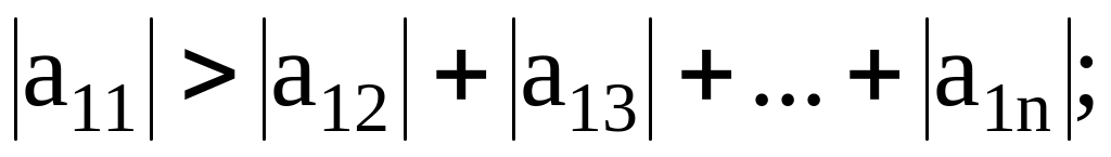 Рассмотрим теперь систему в случае, когда диагональные элементы матрицы А не преобладают над остальными элементами. Из заданной системы выделим уравнения с коэффициентами, модули которых больше суммы модулей остальных коэффициентов уравнения. Каждое выделенное уравнение выписываем в строку новой системы так, чтобы наибольший по модулю коэффициент оказался диагональным. Из оставшихся неиспользованных и выделенных уравнений системы составляем линейные комбинации так, чтобы получить недостающие уравнения, причес диагональные коэффициенты по модулю должны быть больше суммы модулей всех остальных коэффициентов. Необходимо, чтобы при составлении новой системы использовалось каждое уравнение исходной системы. Полученная таким образом система имеет матрицу с преобладающими диагональными элементами, и к ней применимы вышеописанные преобразования.