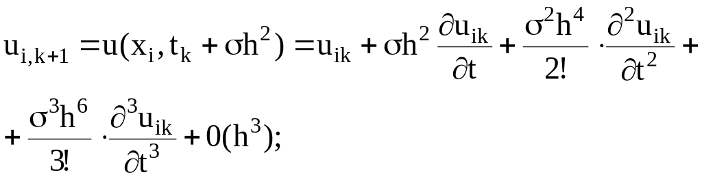 При решении смешанной задачи методом сеток дифференциальное уравнение (7.31) во внутреннем узле заменяется конечно – разностным (7.33). Аналогично тому, как это делалось для дифференциальных уравнений эллиптического типа, можно показать, что погрешность такой замены имеет порядок h2. Погрешность аппроксимации второго начального условия (7.35) имеет порядок h.