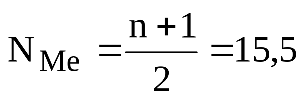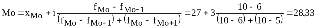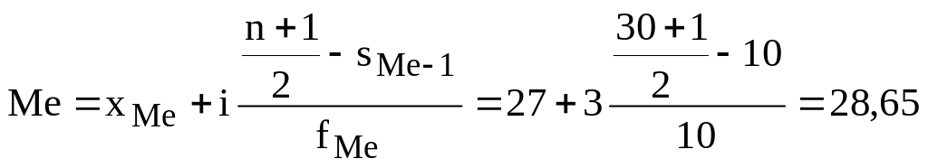 Медианный интервал приходится на группу 27-30 лет находящуюся в середине нечетного ряда